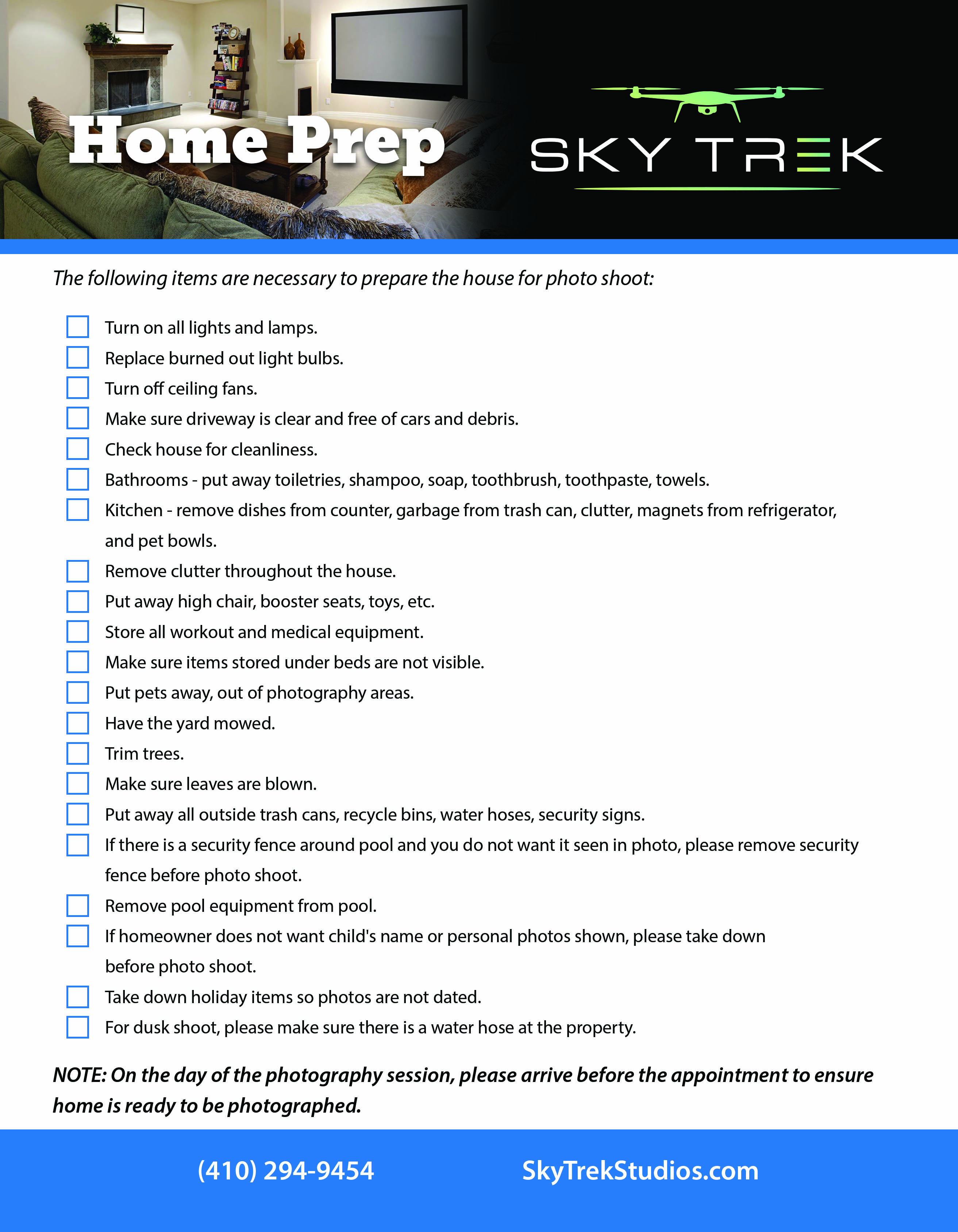 After setting an appointment with Sky Trek, please review the home preparation flyer to ensure your property is ready for the photo shoot. Here you will see all those requirements for photography